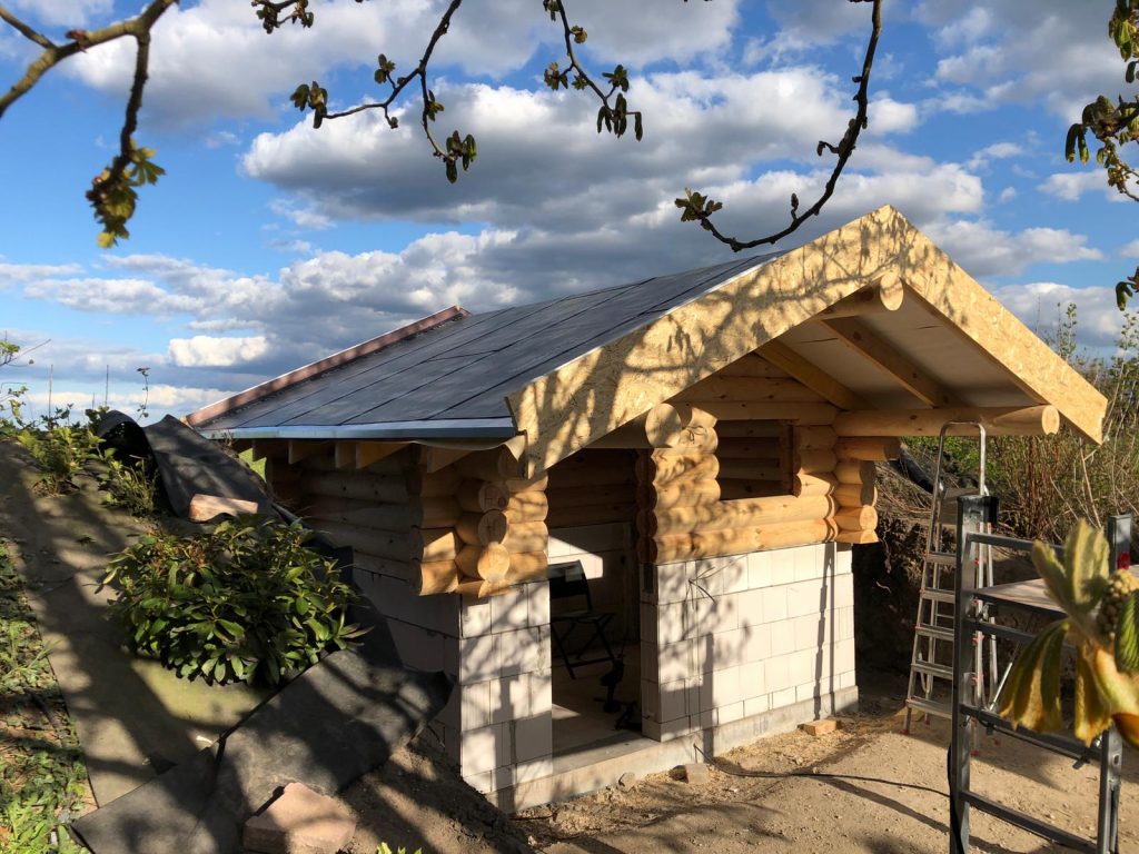 In Berlin entstand eine Erdsauna mit Steinsockel (33 cm; Fundament kundenseitig). TimberTeam liefert den Rundholz-Aufbau als Bausatz, inklusive Dachdämmung. Das Satteldach ist so vorbereitet, dass der Kunde ein Gründach realisieren kann (OSB Nut-und-Feder, keine Bitumenbahnen von TimberTeam). Dazu kommen Details wie ein zu öffnendes Fenster (ohne Kippfunktion) und massive Holzdielen (28 mm). Dieses Projekt zeigt: kompakte Maße, aber sauber vorbereitet für mehr Dämmung und Dachaufbau nach Wunsch.